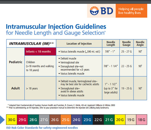 Intramuscular injection guidelines for needle length and gauge selection. Courtesy and © Becton, Dickinson and Company
