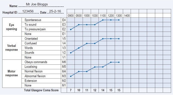 Coma scale chart incorporating the Glasgow Coma Scale. (Adapted from Nicol M, Bavin C, Cronin P et al. 2012 Essential Nursing Skills, 4th edn. Mosby Elsevier, Edinburgh.)
